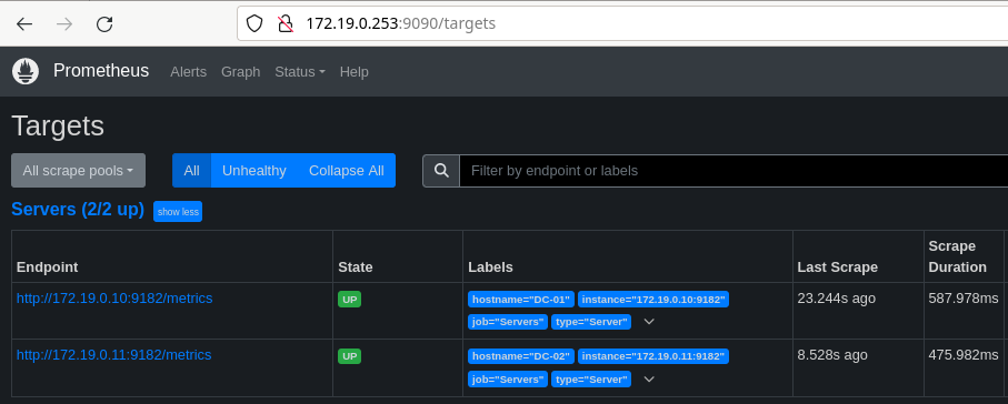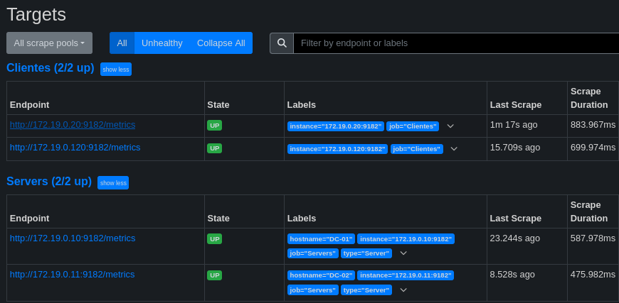 Una vez que hemos configurado en nuestro dominio los exporters, si nos dirigimos a la interfaz web de Prometheus en el puerto 9090 y vamos a la opción de status > targets, veremos que ha detectado los DCs.