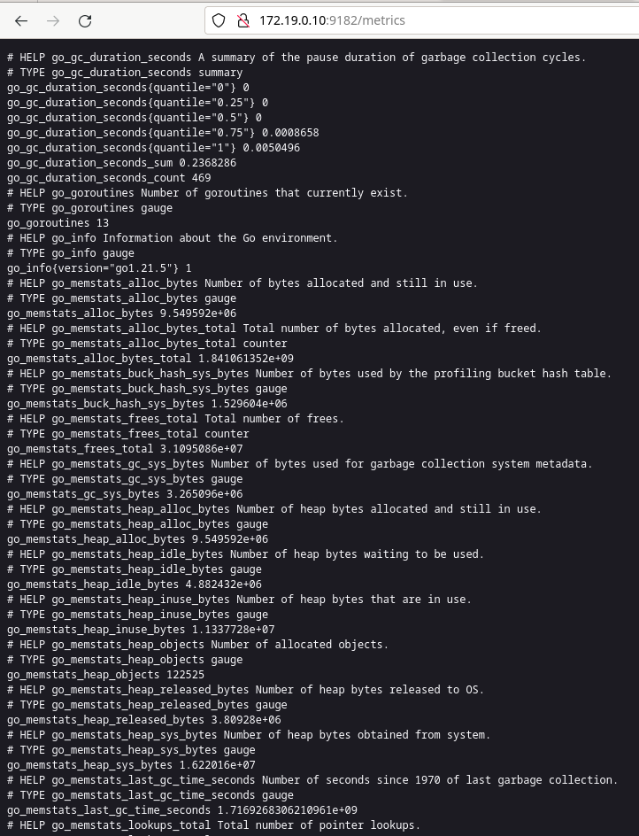 Si pulsamos sobre alguno de los endpoints nos redirigirá a la página creada por los exporters y podremos ver las métricas.