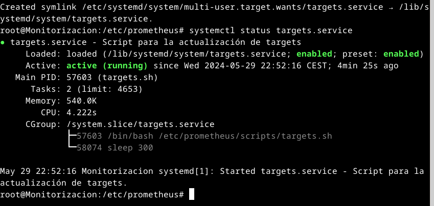 Por defecto prometheus escanea el archivo yml para añadir nuevos targets cada 300 segundos, por lo que crearemos un script para un servicio que se ejecute en bucle cada 300 segundos.
