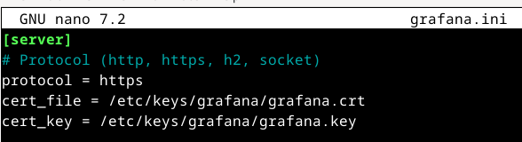 Modificando esas 3 líneas habilitaremos en Grafana el protocolo HTTPS y le indicaremos el certificado y el key necesarios para su verificación.
