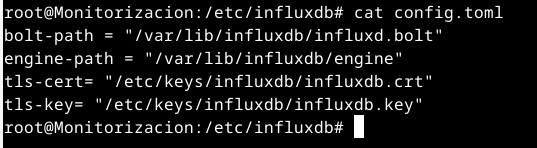Para habilitar el HTTPS en influxdb iremos a la ruta /etc/influxdb y editaremos el archivo config.toml añadiendo las rutas al certificado y la key.