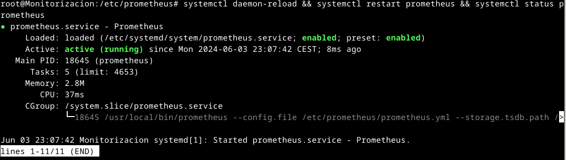Recargaremos los servicios y reiniciaremos prometheus con el comando systemctl daemon-reload && systemctl restart prometheus && systemctl status prometheus